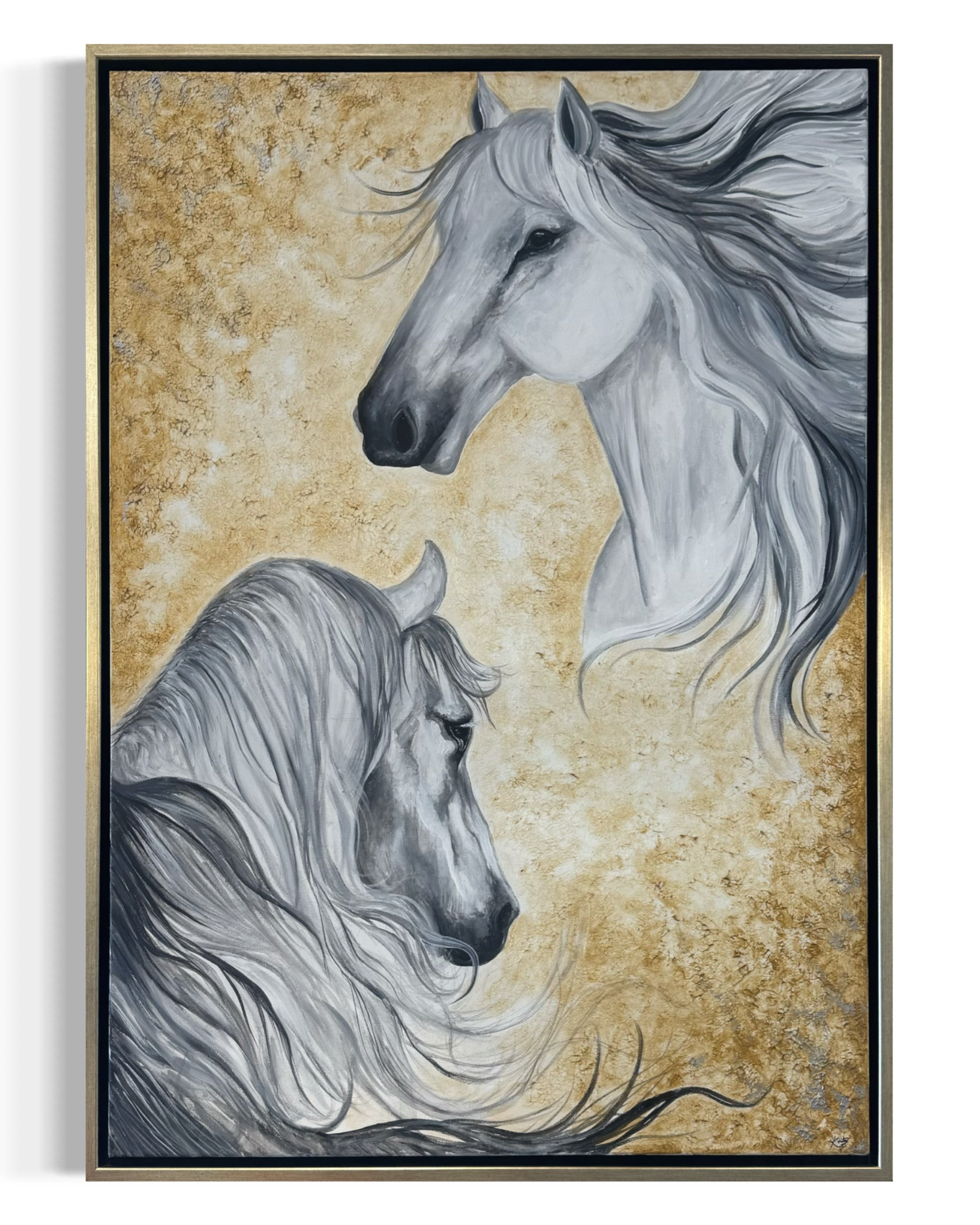 Our collection features original works by a range of artists, represented both online and in our Houston atelier. We also present mixed media works by Valeria Llamosa, combining digital creation with hand-applied techniques.